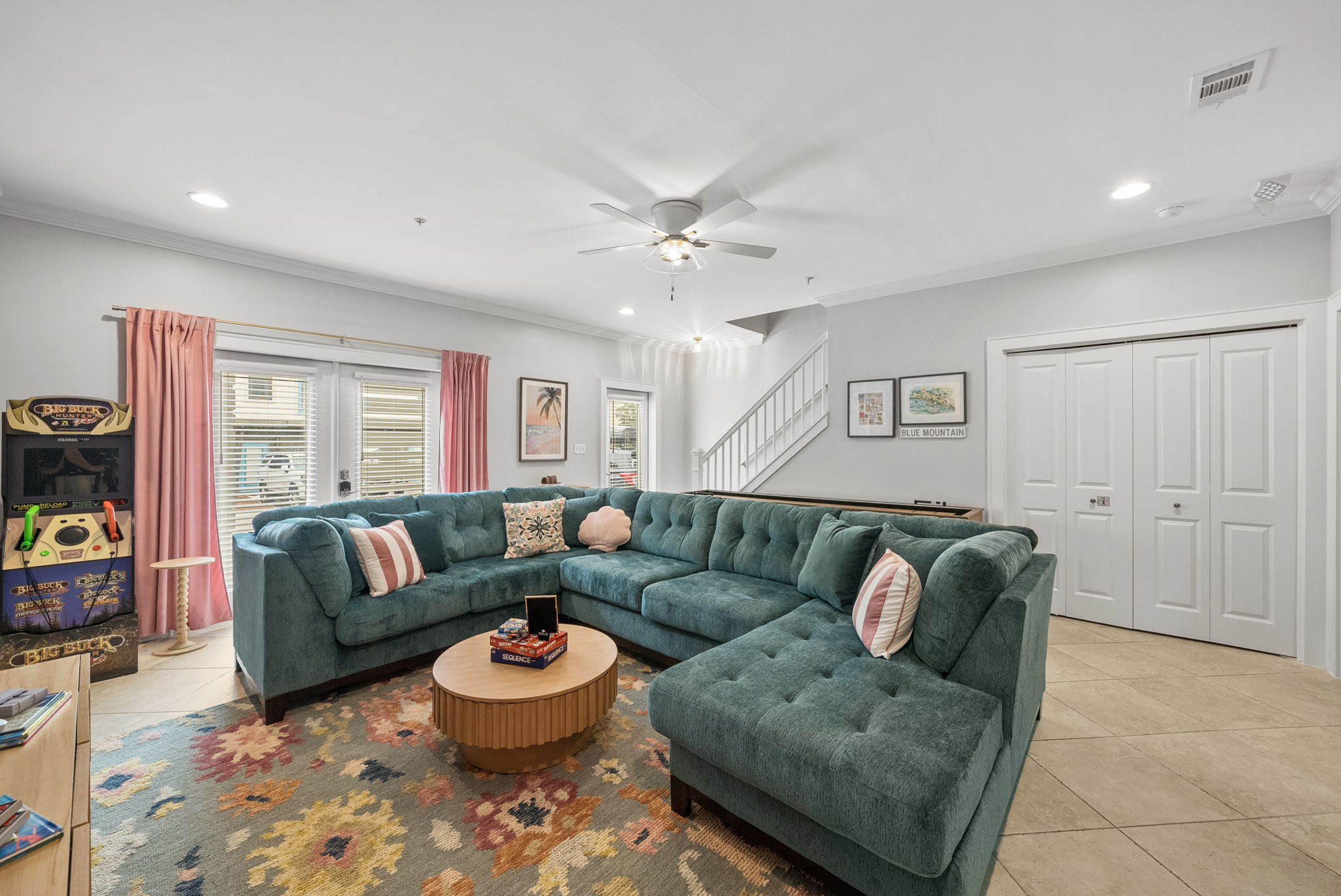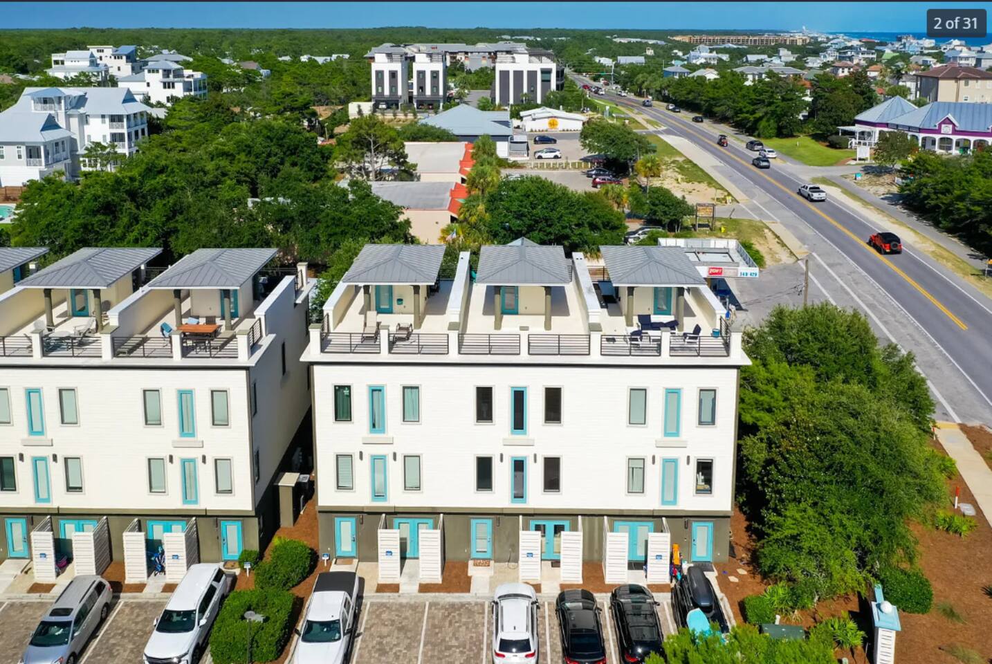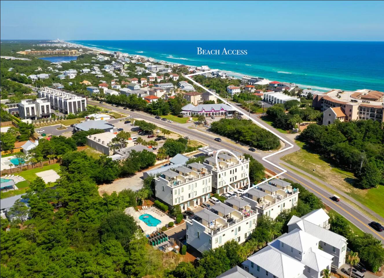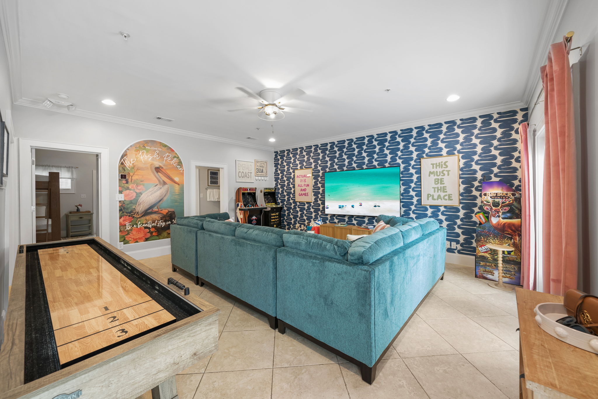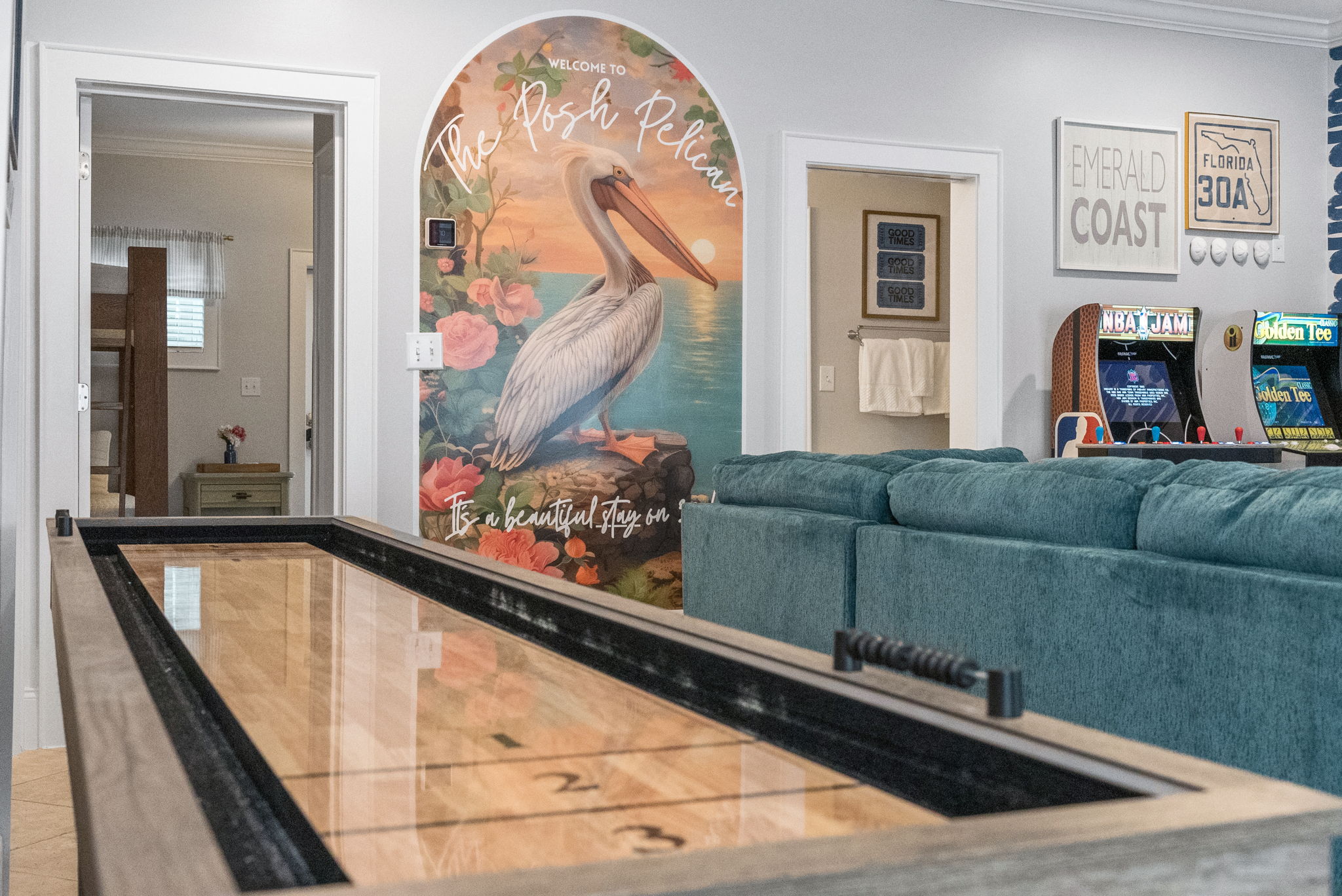 Our townhome has six queen beds and two king beds split between 4 bedrooms (all with attached bathrooms). There are two living areas, one of which is on the ground floor and home to the ULTIMATE game room. The game room has 3 arcade games, shuffleboard, and an 85-inch big screen with both NES Mini and Super NES Mini Nintendo consoles loaded with ALL the games you love. Whew! Want to get away from it all…head to the rooftop deck with peek-a-boo glimpses of the Gulf and views for miles…excellent for sunning or catching the beautiful Florida sunrises and sunsets. The rooftop has two seating areas and outdoor games, because…OF COURSE! We are a short 5-minute walk to Blue Mountain Beach and close to several 30A-famous spots and restaurants, including the 30A-renowned Blue Mountain Creamery, Blue Mountain Bakery and Cowgirl Kitchen (just to name a few)! The Posh Pelican is perfect for families or groups of all ages with plenty of space to spread out across three floors (plus the rooftop!). And, the townhome is fully stocked with many of the things you may need to make your stay perfect. Here are some of the things we have available: -A fully stocked kitchen with coffee makers, blender, crockpot, pots and pans, utensils, etc. -Smart-tvs in both living areas to allow for streaming of your favorite programming -2GB internet and 2 monitors available for use -Heated community pool (seasonally) -Community barbecue grill -Beach cart, chairs, coolers and towels at-the-ready for your beach adventures -Two pack 'n’ plays -Booster seat/high chair that attaches to a kitchen chair -Board games, books and toys And here are some more specific details of our townhome: There are 4 bedrooms + 4 bathrooms: -King Master bedroom with ensuite bath (tub/shower combo) -King Bedroom with shared bath (private entrance; shower) -2 Queen Bedroom with private bath (shower) -Quad Queen “Bunk” Room with two queen-over-queen, adult-weight rated bunk beds, shared bath (private entrance) -Open concept living room/kitchen area with island and ample seating and fully stocked kitchen. -Game Room with multiple arcades, shuffleboard, 85-inch screen and two Nintendo gaming systems, etc. -Rooftop terrace with two seating areas; one with a sectional seating area and one with two loungers and an Adirondack...perfect for morning coffee or after dinner drinks or just sitting back, soaking it all in.
