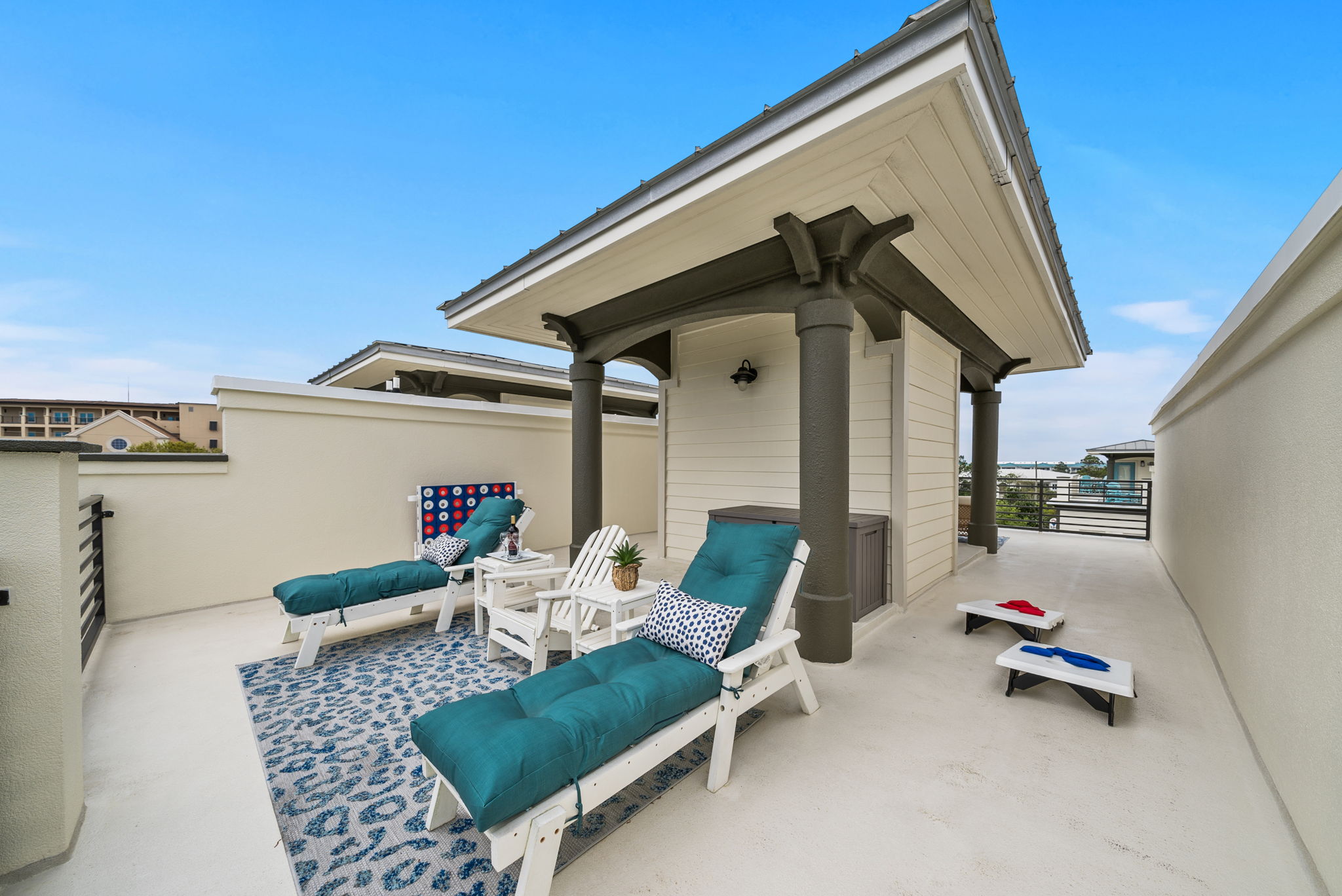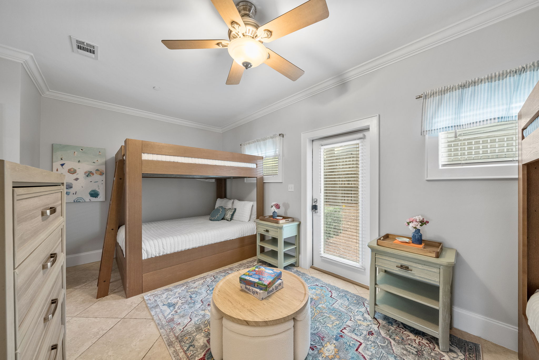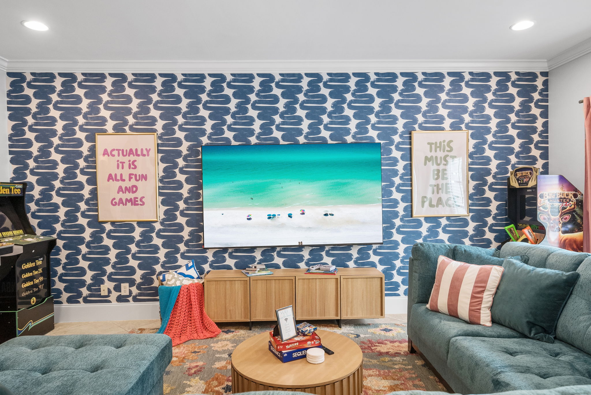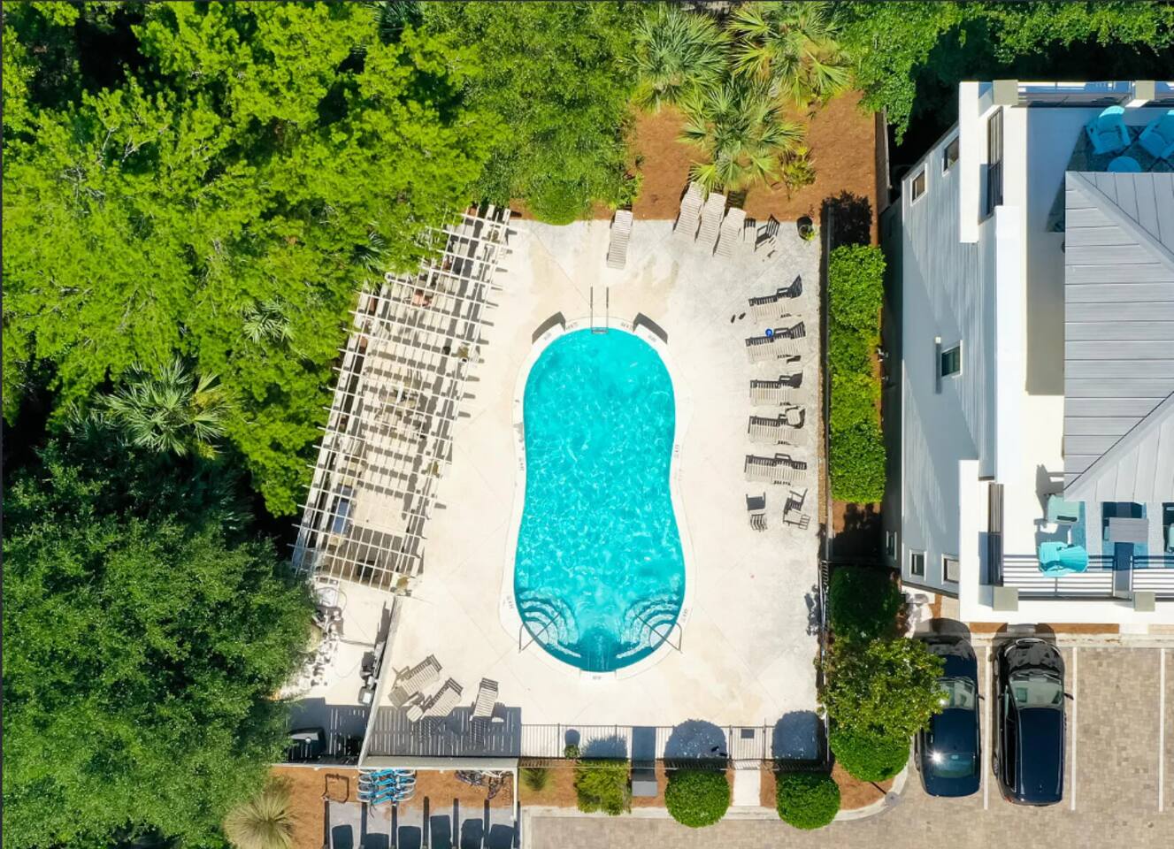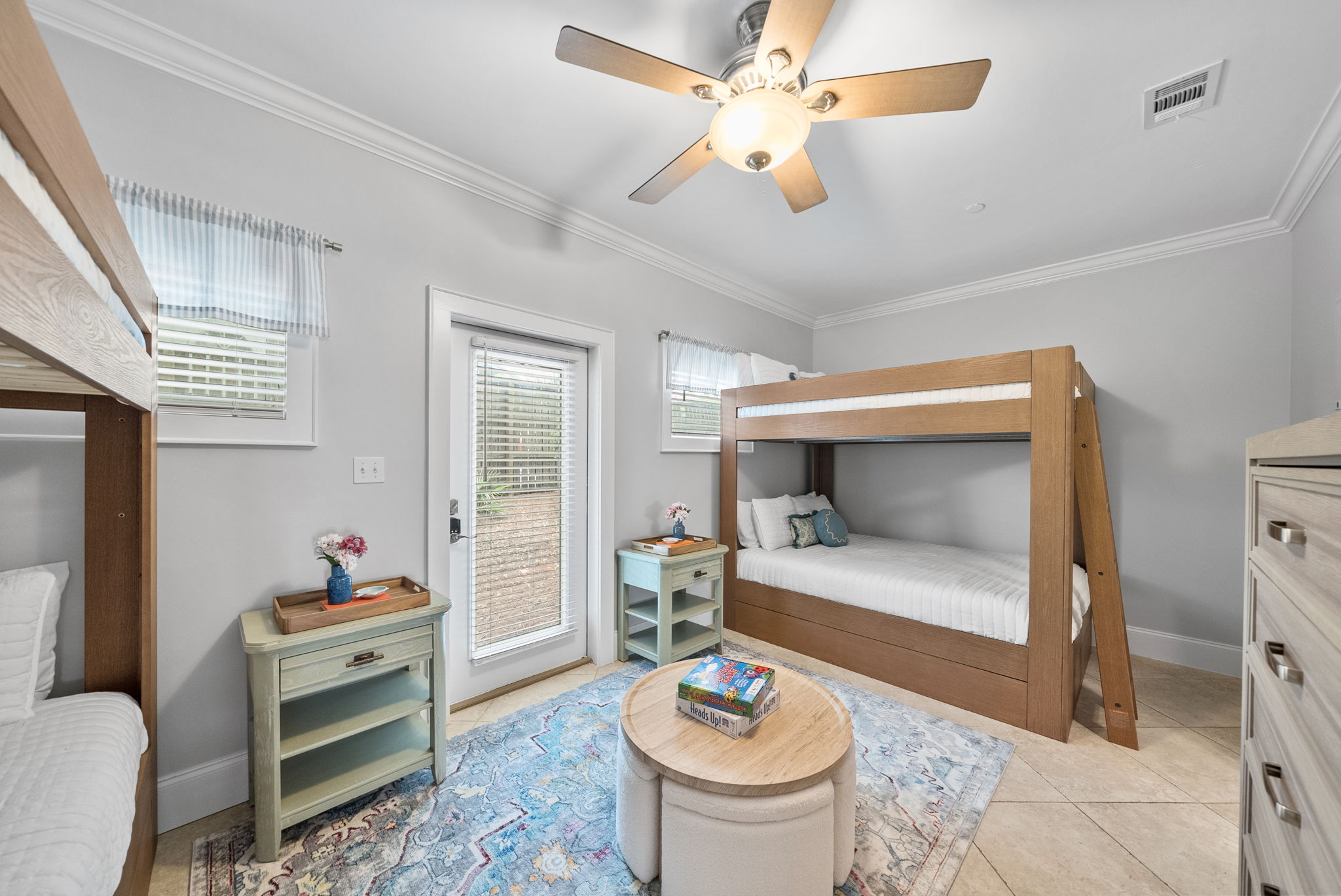 Our townhome has six queen beds and two king beds split between 4 bedrooms (all with attached bathrooms). There are two living areas, one of which is on the ground floor and home to the ULTIMATE game room. The game room has 3 arcade games, shuffleboard, and an 85-inch big screen with both NES Mini and Super NES Mini Nintendo consoles loaded with ALL the games you love. Whew! Want to get away from it all…head to the rooftop deck with peek-a-boo glimpses of the Gulf and views for miles…excellent for sunning or catching the beautiful Florida sunrises and sunsets. The rooftop has two seating areas and outdoor games, because…OF COURSE! We are a short 5-minute walk to Blue Mountain Beach and close to several 30A-famous spots and restaurants, including the 30A-renowned Blue Mountain Creamery, Blue Mountain Bakery and Cowgirl Kitchen (just to name a few)! The Posh Pelican is perfect for families or groups of all ages with plenty of space to spread out across three floors (plus the rooftop!). And, the townhome is fully stocked with many of the things you may need to make your stay perfect. Here are some of the things we have available: -A fully stocked kitchen with coffee makers, blender, crockpot, pots and pans, utensils, etc. -Smart-tvs in both living areas to allow for streaming of your favorite programming -2GB internet and 2 monitors available for use -Heated community pool (seasonally) -Community barbecue grill -Beach cart, chairs, coolers and towels at-the-ready for your beach adventures -Two pack 'n’ plays -Booster seat/high chair that attaches to a kitchen chair -Board games, books and toys And here are some more specific details of our townhome: There are 4 bedrooms + 4 bathrooms: -King Master bedroom with ensuite bath (tub/shower combo) -King Bedroom with shared bath (private entrance; shower) -2 Queen Bedroom with private bath (shower) -Quad Queen “Bunk” Room with two queen-over-queen, adult-weight rated bunk beds, shared bath (private entrance) -Open concept living room/kitchen area with island and ample seating and fully stocked kitchen. -Game Room with multiple arcades, shuffleboard, 85-inch screen and two Nintendo gaming systems, etc. -Rooftop terrace with two seating areas; one with a sectional seating area and one with two loungers and an Adirondack...perfect for morning coffee or after dinner drinks or just sitting back, soaking it all in.
